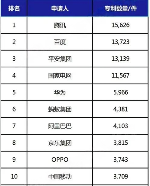 知识产权机构IPRdaily近日发布中国人工智能发明专利企业排行榜。数据显示,腾讯以15626件专利数量位居该榜单榜首;百度以13723件发明专利排名第二;平安集团以13139件发明专利排名第三。